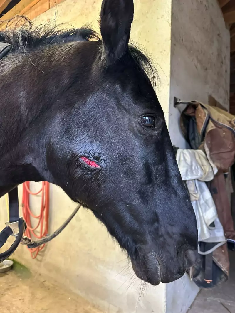 Die Wunde haben wir dann mit einem Salbenpflaster versorgt und mit Tape und einer engen Fliegenmaske gesichert.