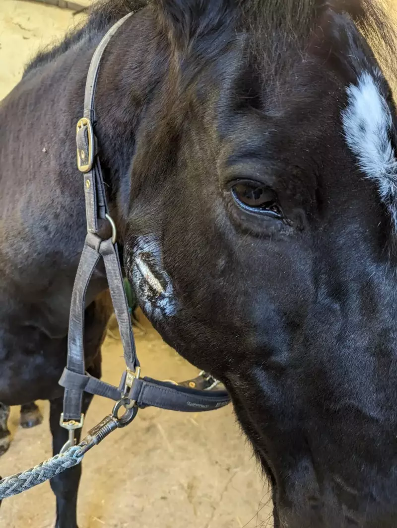 Nach ein paar Tagen begann die Wunde etwas zu nässen und das Verbandsmaterial, das ich mit der Fliegenhaube befestigt hatte hielt nicht mehr. Wahrscheinlich hat es durch den Heilungsverlauf auch ziemlich gejuckt und mein Pferd hat sich mit Sicherheit gekratzt.